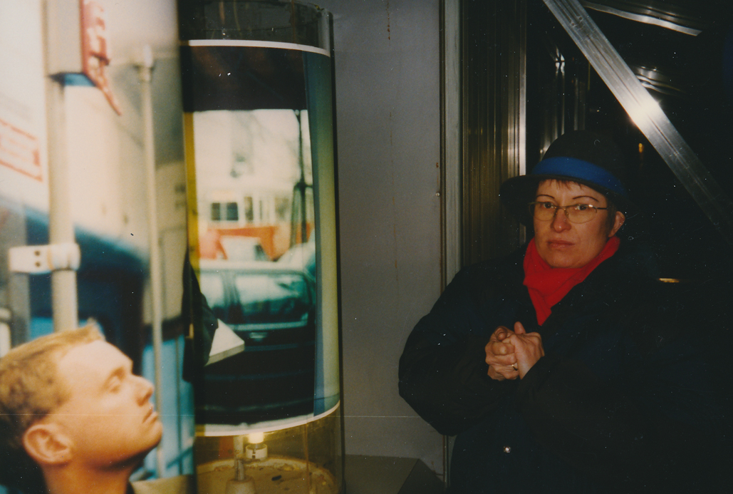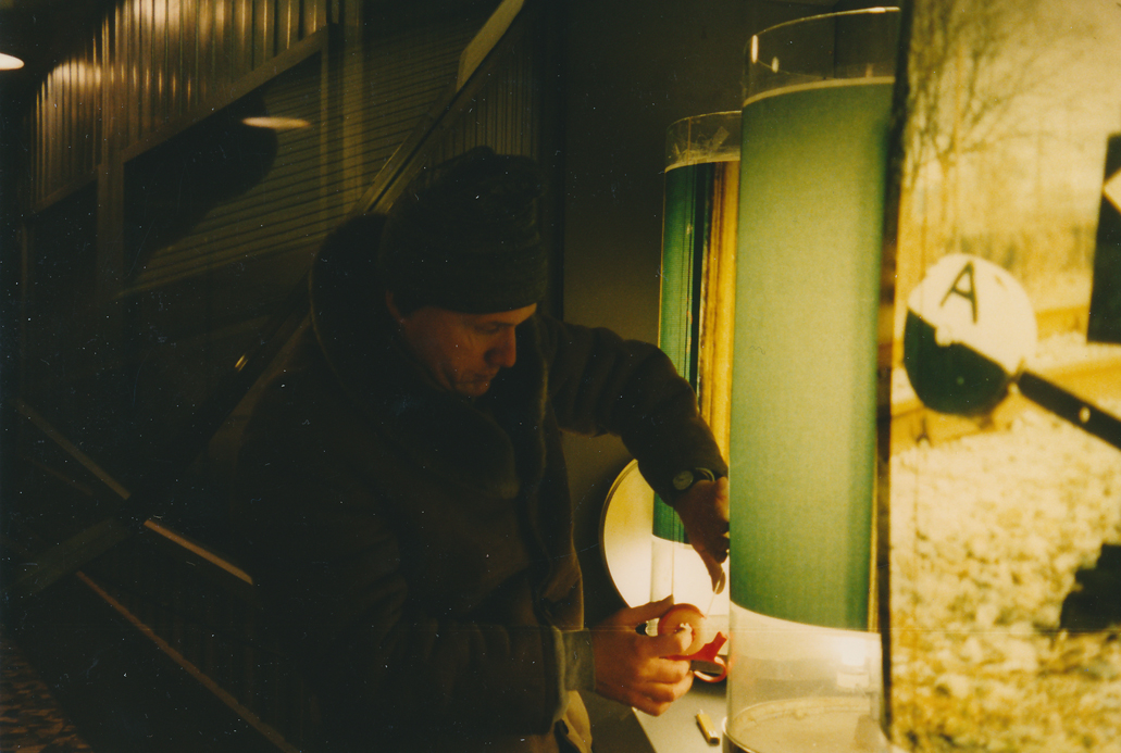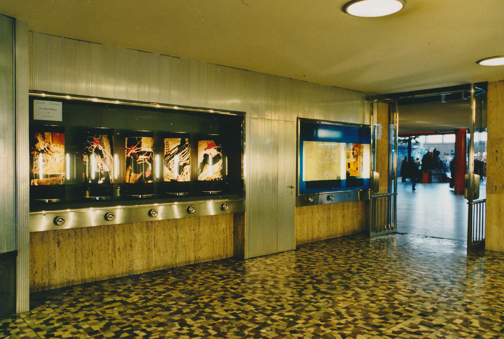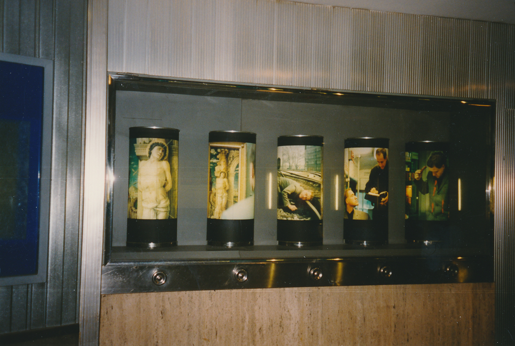 Von 1996 bis 2003 betrieben wir eine zweimonatlich wechselnde permanente Fotoinstallation am Ort der ehemaligen Fahrplanhinweise am Wiener Südbahnhof. Diese Fahrplanhinweise waren auf drehbaren durchleuchteten Glaszylindern angebracht, die uns schon seit längerer Zeit fasziniert hatten. Als sie bzw. ihre Vitrinen nur mehr als Werbeflächen angeboten wurden, bemühten wir uns um die Möglichkeit, dort unsere Fotoarbeiten präsentieren zu können. Unser Konzept war einfach: Wir stellten Fotoserien her, die Narration und optische Prägnanz so verbanden, dass ein Bahnhofslaufpublikum angeregt wurde, diese Zylinder wieder in Betrieb zu nehmen. Die Verbindung von Kinetik (Drehbarkeit der Zylinder) und Lichtprojektion (Beleuchtung der Zylinder) assoziieren wir mit einem Animations-Effekt, die Serien mit ihrer „Story“ – auch wenn diese nur angedeutet ist – kommen dieser Assoziation entgegen. Da wir uns damals in unseren Medienarbeiten (Fotostories, Filme, Installationen) einerseits mit dem Thema Erzählung – Serie, anderseits mit dem Thema Licht (Leuchtkästen, Projektionen, Durchleuchtung usw.) beschäftigten, verband sich für uns der serielle Charakter dieser Installation (5 Bilder) ideal mit ihrer Form als Leuchtobjekte. Die Drehbarkeit bot die interaktive Kontaktaufnahme des Betrachters, der Betrachterin mit der Arbeit und verwies zugleich auf unsere Vorliebe für das Aufspüren von (scheinbaren und wirklichen) Parallelitäten unterschiedlicher Medien (z.B. das Foto als Filmstill, der Zylinder als Gebetsmühle, die Fotostory als literarische Form usw.) Für uns war es wichtig, dass durch die Kontinuität der Installation so etwas wie ein Festwachsen dieser Kunstzelle im Südbahnhof ermöglicht wurde. Die Passantinnen und Passanten warteten im besten Fall schon immer auf die neue Serie und benutzten die Zylinder, um hinter die Geschichte zu kommen oder sich einfach zu unterhalten.